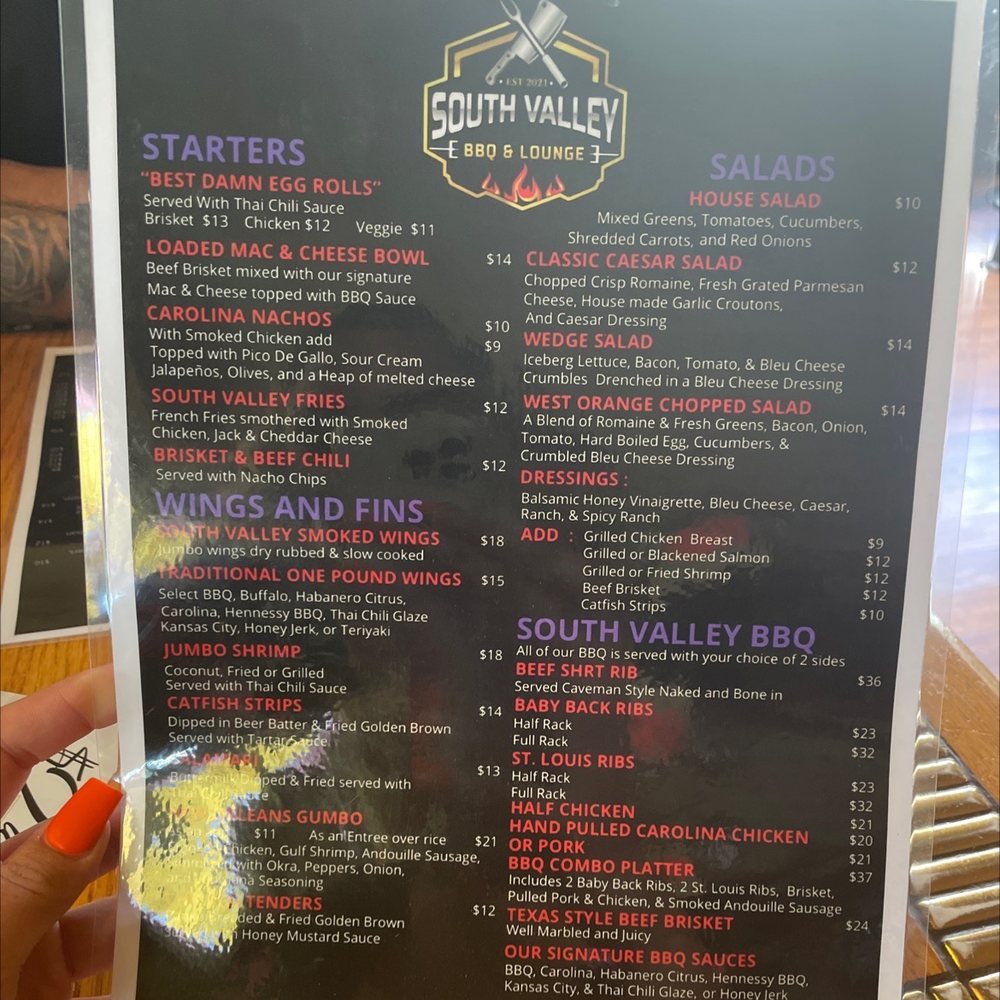Introducing the menu at South Valley BBQ and Lounge, a jazz & blues bar with a focus on delicious barbeque dishes. Located in West Orange, NJ, this women-owned restaurant offers a range of mouthwatering options, from Build Your Own Burgers to Texas Beef Brisket sandwiches and Jumbo Fish Sandwiches. The menu also includes unique Bar Pies like Meat Lovers Pizza and Cheese Lovers Pizza. Customers rave about the flavorful smoked wings, Mac and cheese, egg rolls, and pulled pork sliders. With live music, a full bar, and happy hour specials on Thursdays, Fridays, and Saturdays, South Valley BBQ and Lounge promises a great experience for diners. Whether you're a meat lover or looking for vegetarian options, this restaurant caters to all tastes. Don't miss out on the new taste and vibe brought by the new ownership at South Valley BBQ and Lounge!